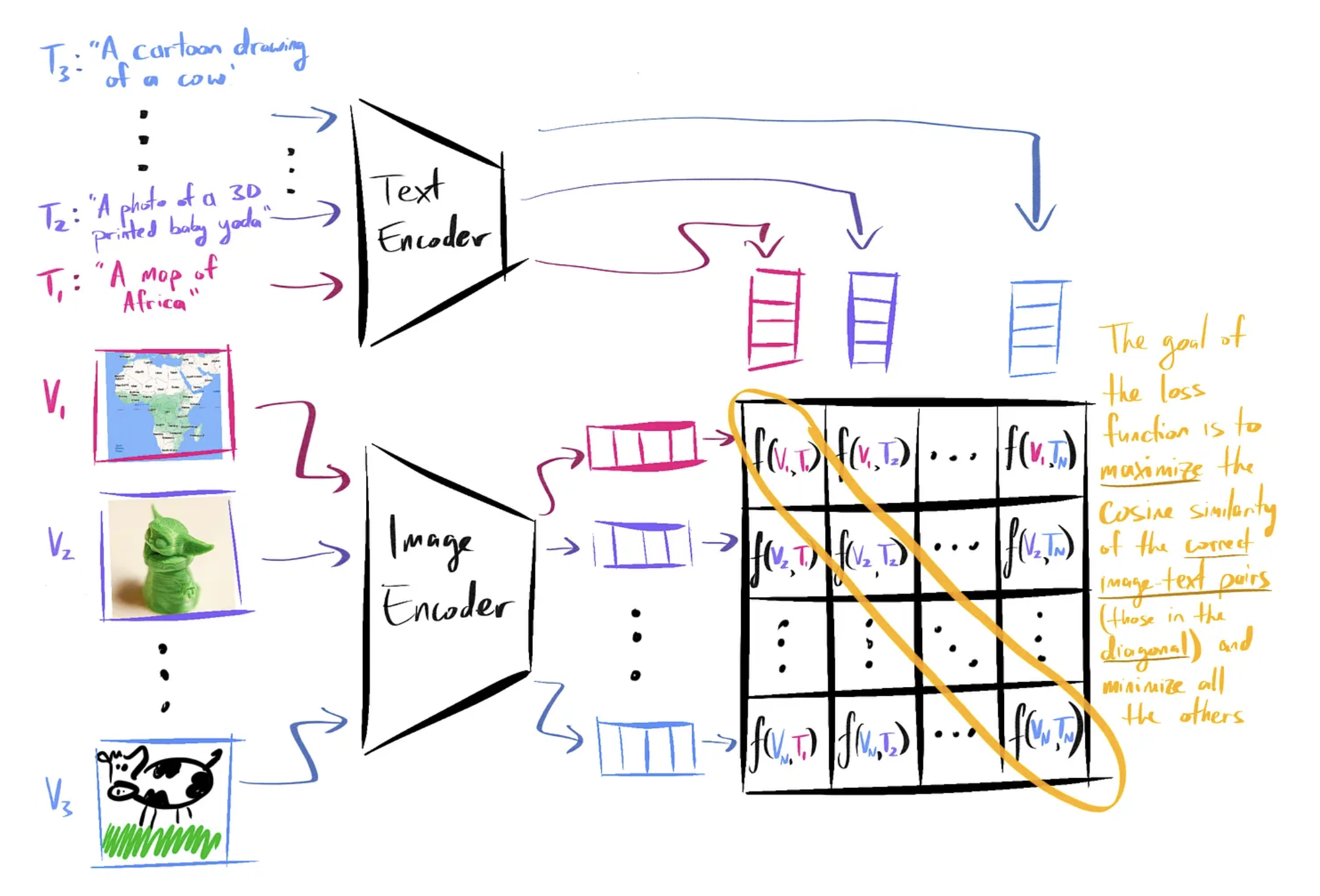 In training, it tries to maximize the cosine similarity between correct image-caption vector pairs, and minimize the similarity scores between all incorrect pairs.