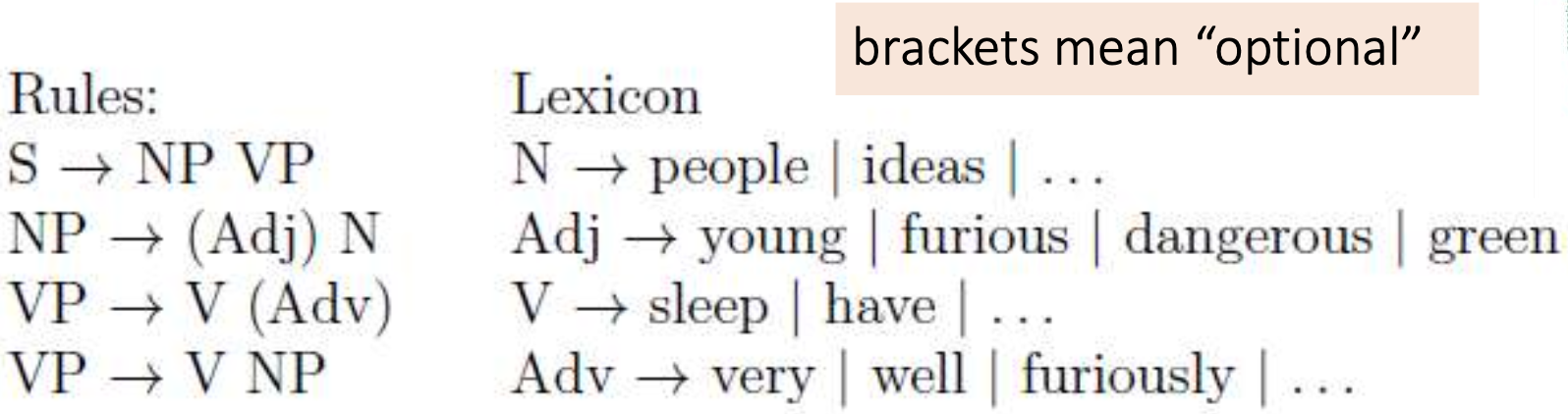 A CFG for natural language models how constituents are built up and combined. Components: rules and lexicon.