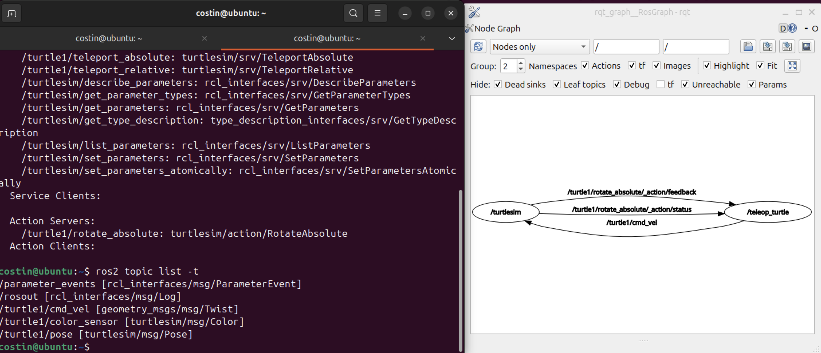 Example: $ ros2 topic pub /turtle1/cmd_vel geometry_msgs/msg/Twist "{linear: {x: 2.0}, angular: {z: 1.8}}". My turtle now does circles like a dog chasing its tail.