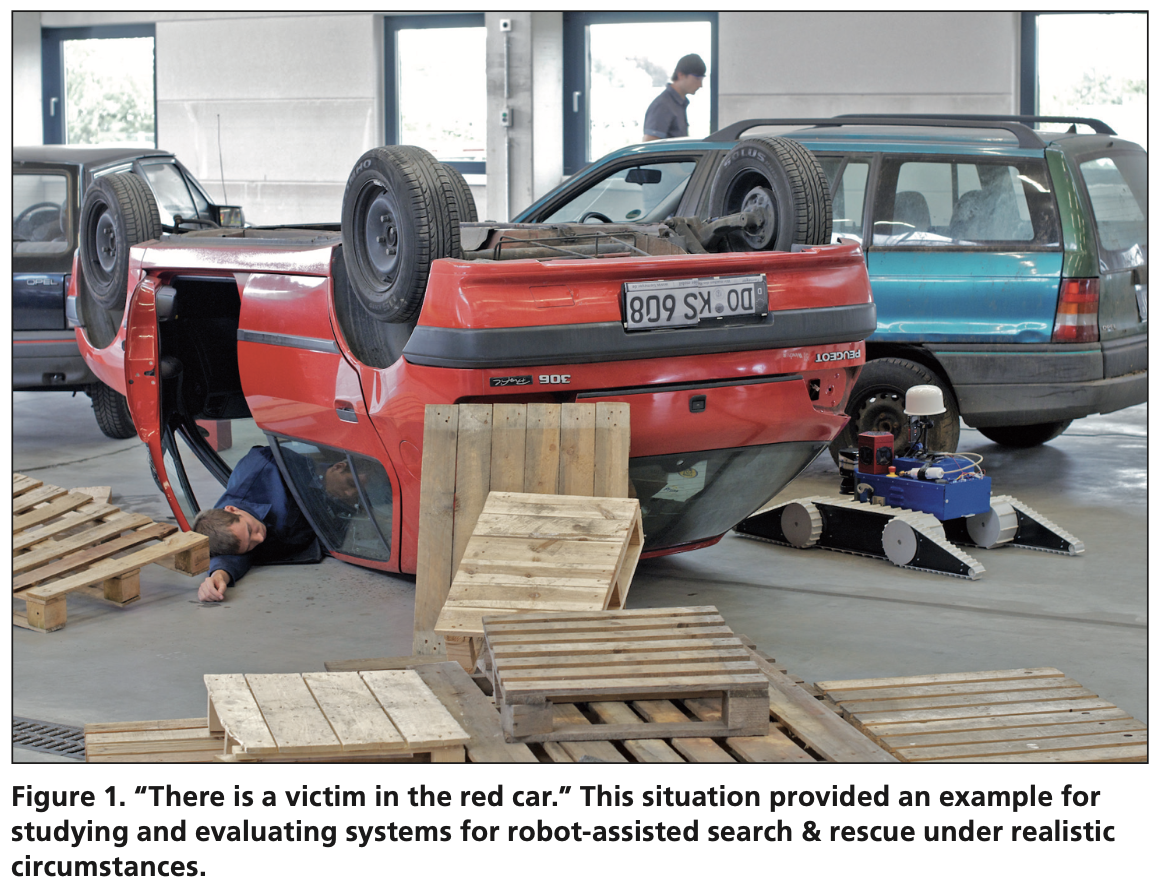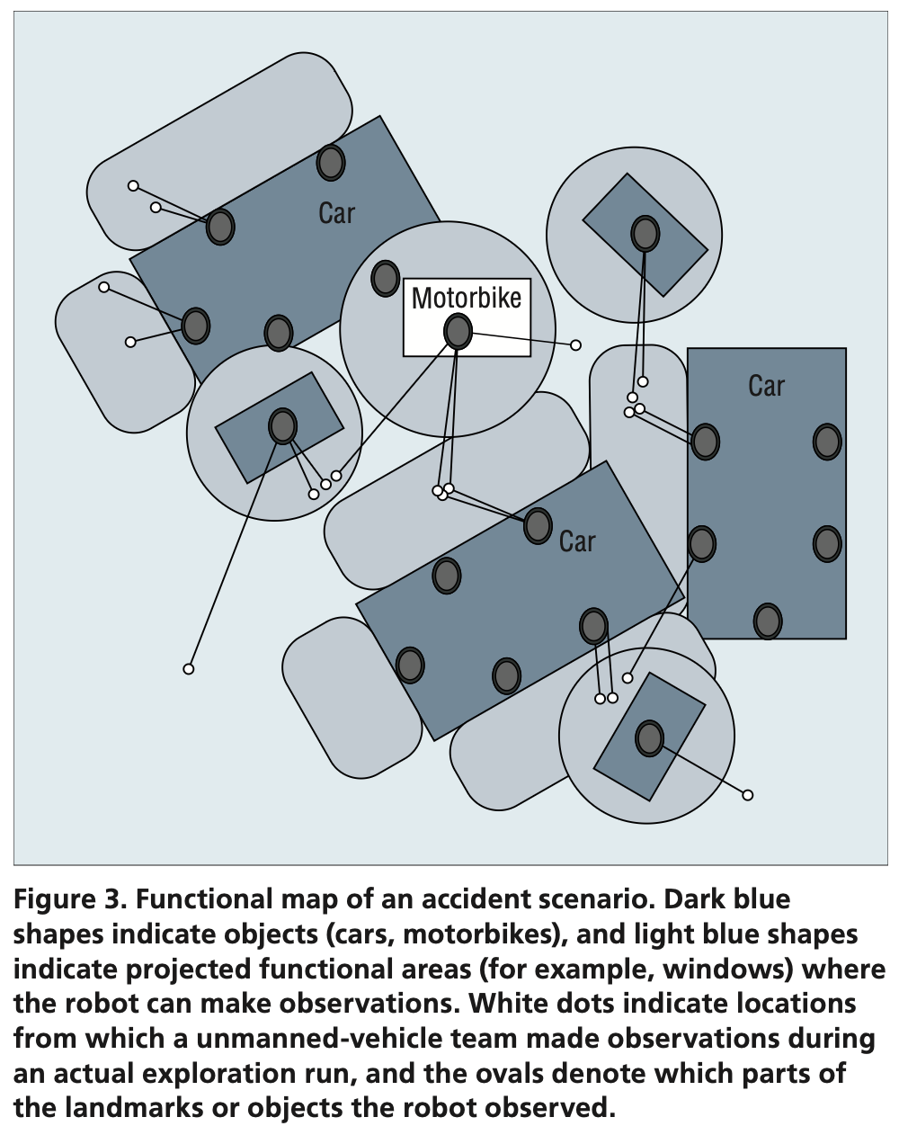 Let’s assume the following accident proposed in the study: several cars are involved, identifiable by color, and a lot of rubble has resulted. The UAV mission specialist, looking at the UAV’s video feed, reports that there appears to be a victim in the red car.