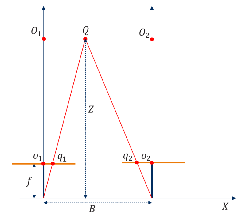 - But in reality, you won’t find this; almost never (with some small exception like room mapping). Once we know how the cameras are oriented relative to each other, we mathematically project both images onto a common virtual plane (the blue plane in the diagram). This virtual plane is parallel to the baseline. After this projection, the “tilted” images are transformed into “normal” images.