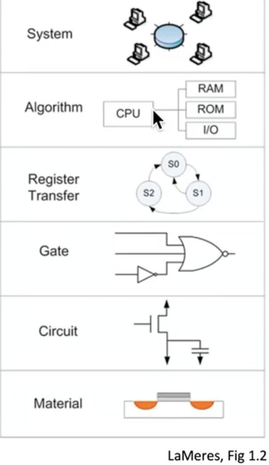 The Figure above is from the book mentioned before. It represents the different level of description / detail that occur from specification to FPGA. As we go down, we go more in detail, and as we go up we abstract more. Every component can be viewed as: