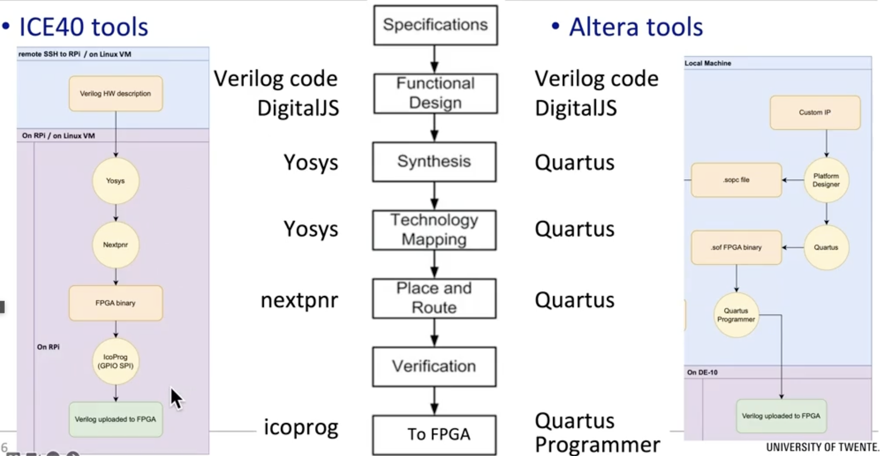 In this course we either use Altera tools or ICE40 tools. In Altera if you make a mistake in the number in the name or whatever, everything blows. In ICE40 you do a functional simulation (is the logic right? you can check). With icoprog you put the logic in FPGA.