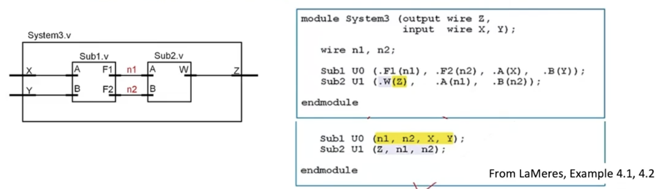 Implicit port mapping: no submodule port names; connections must be in the same order.