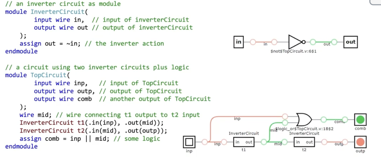 reg a = 0; // Single-bit registerb = 1; // Value HIGHc = X; // X is Unknownd = Z; // Z is floating, high impedance supported by DigitalJSinteger myNum = 531; // 32-bit vartime myTime = $time; // for simulation onlywire w = a || b; // OR gatewire z; // declare wire to assign laterassign z = w && a; // assign prev z to AND gate.reg[7:0] count = 0; // value 0..255reg[1:0] twoBit = 2 * b01; // value 1reg[3:0] arr[8]; // eight 4-bit valuesreg[3:0] q = 4'ha; // decimal value 10reg[2:0] r = 3'b110; // decimal value 6reg[2:0] s = 3'sb111; // decimal value -1"""Base: binary, octal, decimal, hexadecimalSigned base: sb, so, sd, sh"""