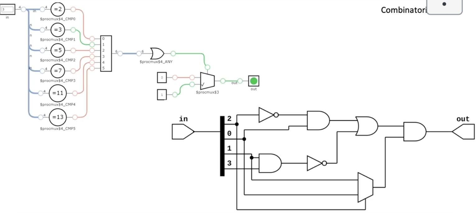 module PrimeTest( input wire[3:0] in, // 4-bit num, 0..15 output wire out); always @(*) // for every input basically, execute always case(in) 2,3,5,7,11,13: out = 1; // prime default: out = 0; // not prime endcaseendmodule