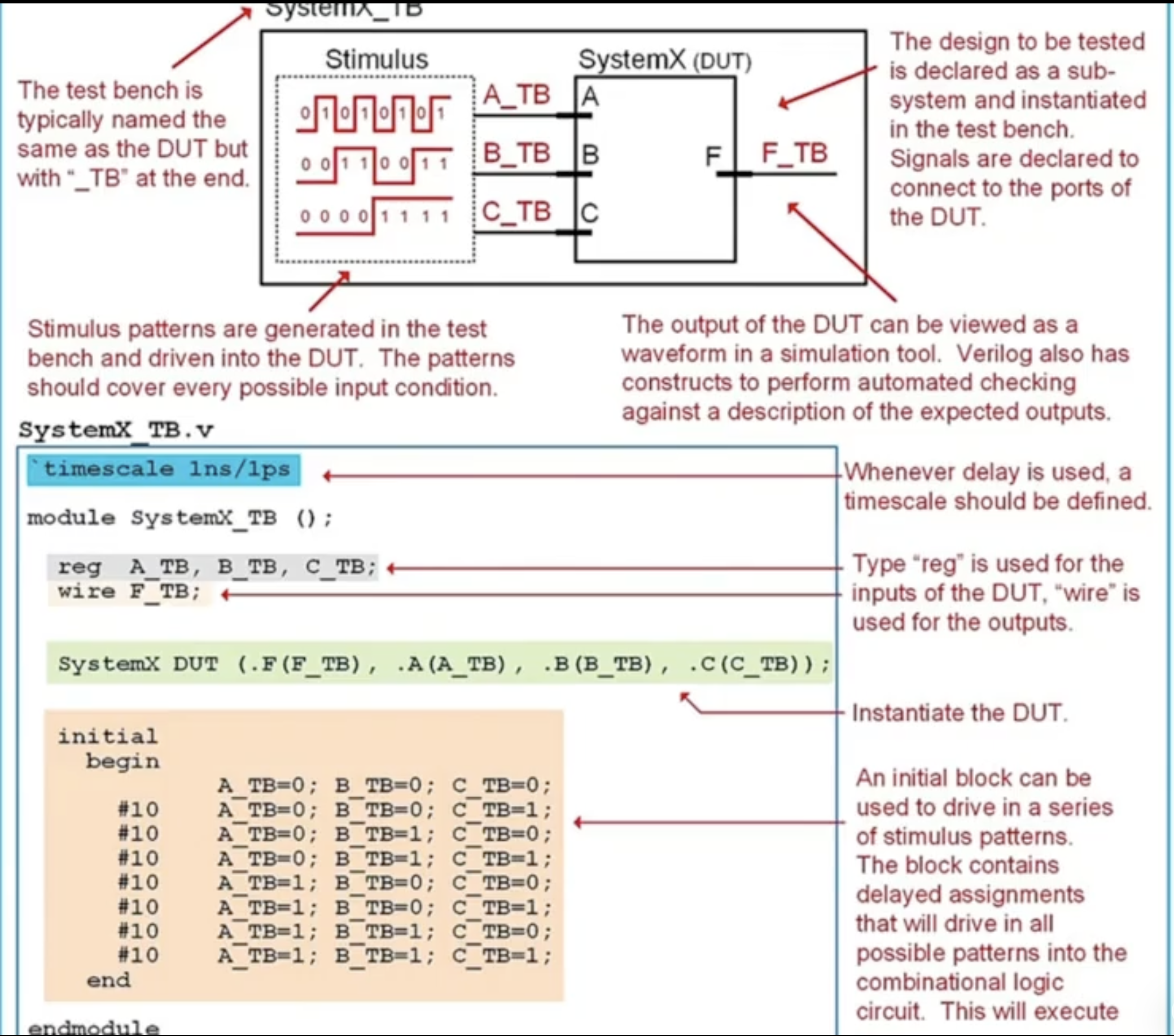 The device under test we already have. so we need to produce inputs and capture the outputs. Verilog provides constructs to build TBs. I did not necessarily get this part. Ok based on the Figure below I understand. Basically I need to name the Test Bench as my main system with _TB after it and declare the complex input sequence meant to test the main system.