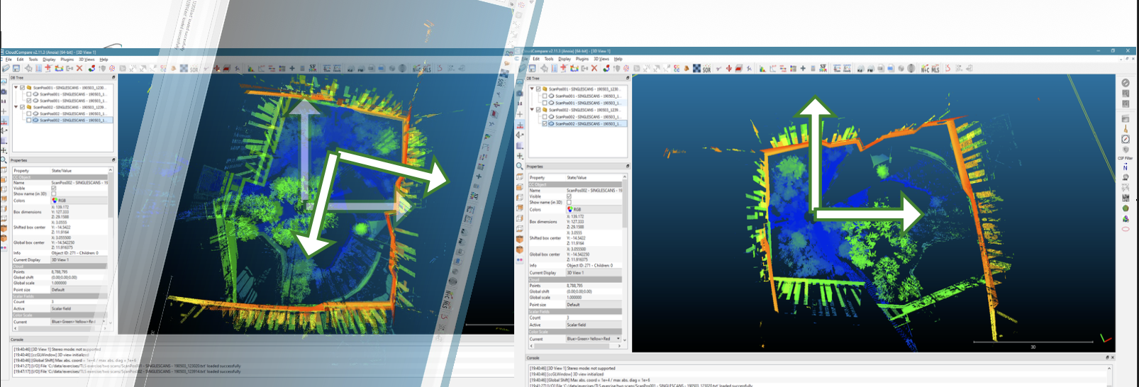 - Relative Orientation (Registration): This involves aligning scans using at least three corresponding points (Rotation & Translation)