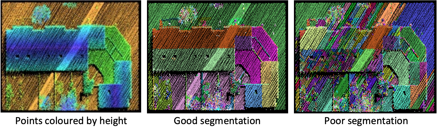 The extraction of planar faces is the first step in many procedures for 3D modelling of buildings. The left picture below shows a point cloud of a building (and some fences and vegetation) coloured by height. In the other two pictures, the points have been coloured by segment number. Points that were recognised to be in the same planar face were given the same segment number. In the case of the middle picture, the segmentation has been successful. All planar roof faces have been correctly identified. The right picture shows an example of an over-segmentation. Due to non-optimal parameter settings, many roof faces are split into multiple segments.