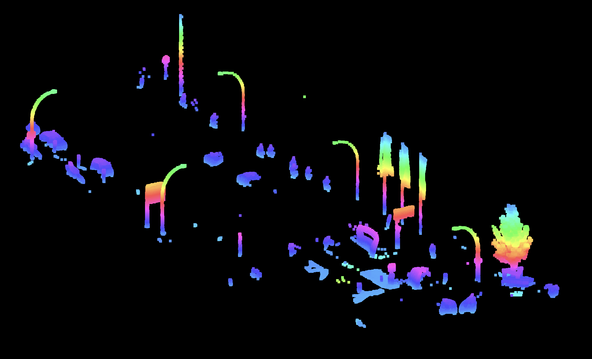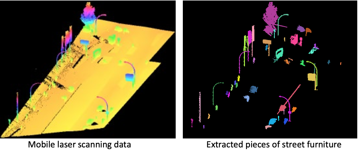 We had a piece of a point cloud obtained by Mobile Laser Scanning (MLS). My task is to process this point cloud such that the points belonging to the same piece of street furniture are given the same segment number and the points on the ground have been removed. This is shown in the right figure.