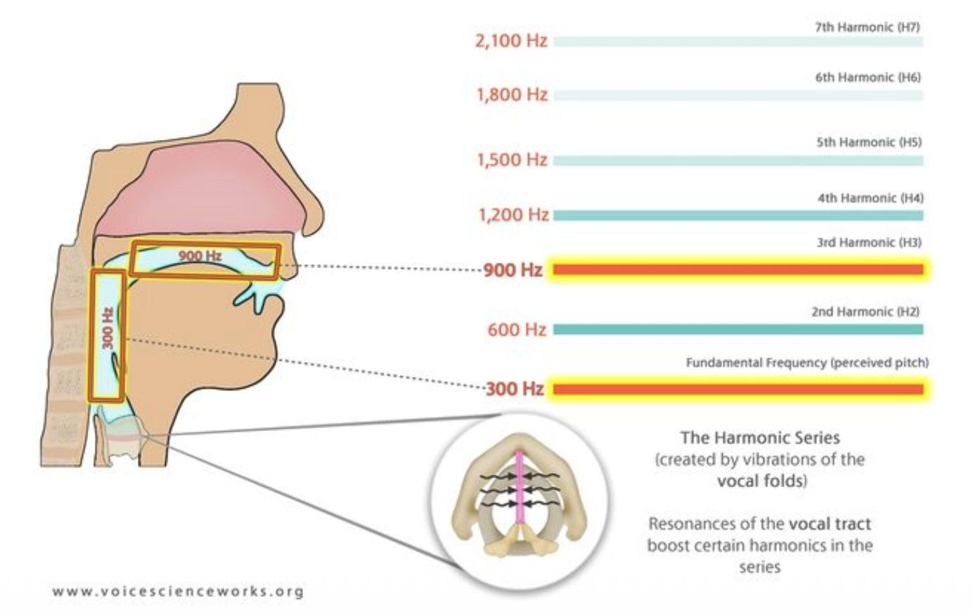 The higher the harmonic the softer the vibration/volume. With only the vocal folds, higher harmonics would barely be heard. We have a resonator to boost harmonics: the vocal tract.