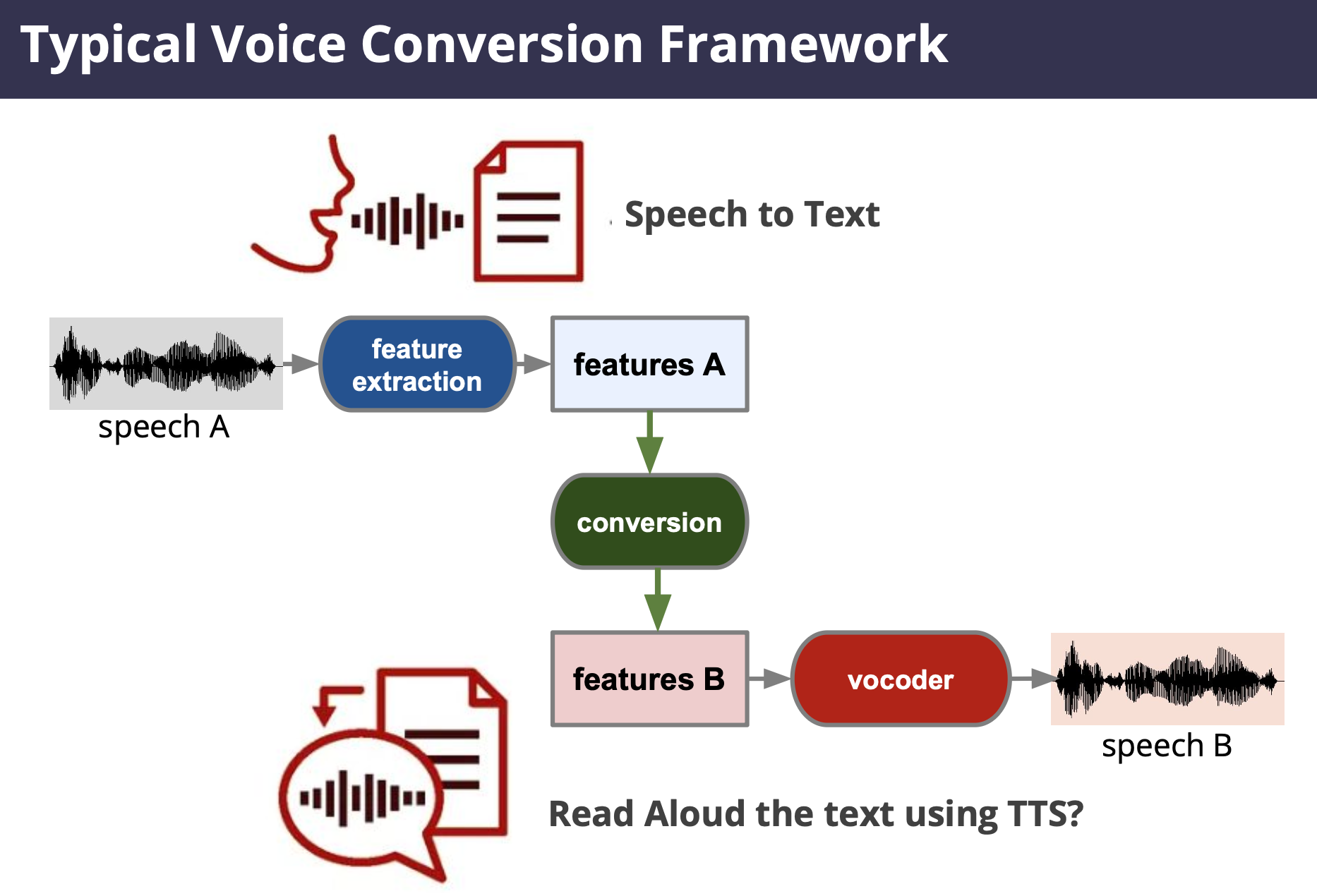 - Synthesize speech from the feature sequence.
