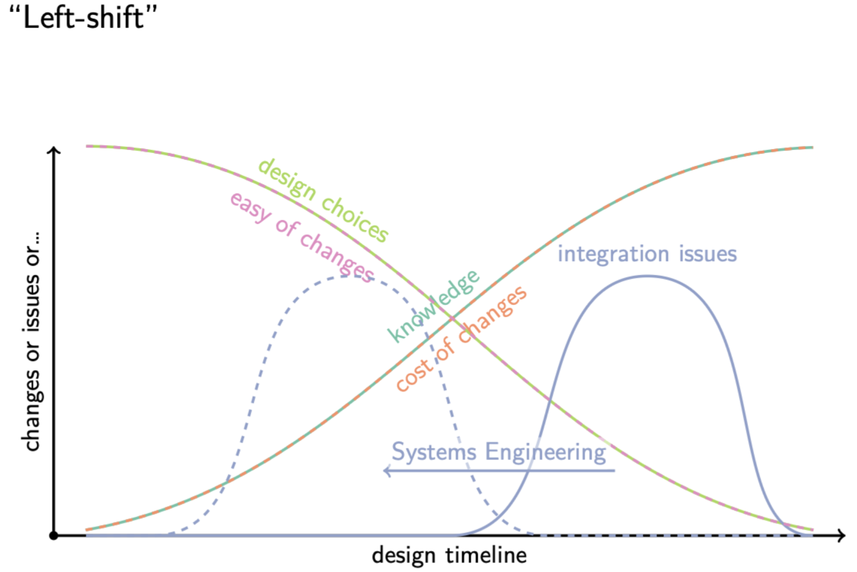 Left shift is making early design choices with the later phases in mind, hoping to prevent integration issues, by identifying potential issues early on and making changes when that is still easy and cheap.