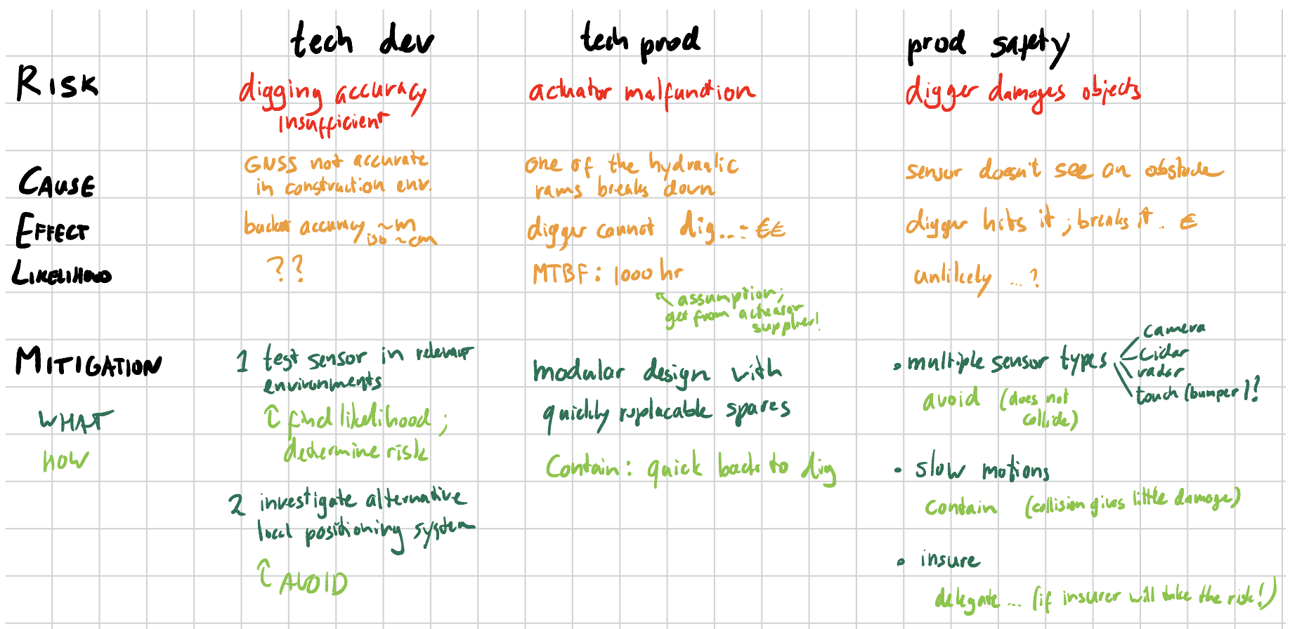 For example, let’s identify 3 risks for a robot digger on construction sites. And for each formulate the cause, the effect and the likelihood. Also choose one mitigation and describe how to lower the risk