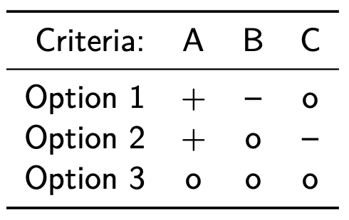 - Belief decision matrix: this helps when dealing with uncertainty but you have some basis for estimating likelihoods, unlike minimax/maximin which assume complete uncertainty