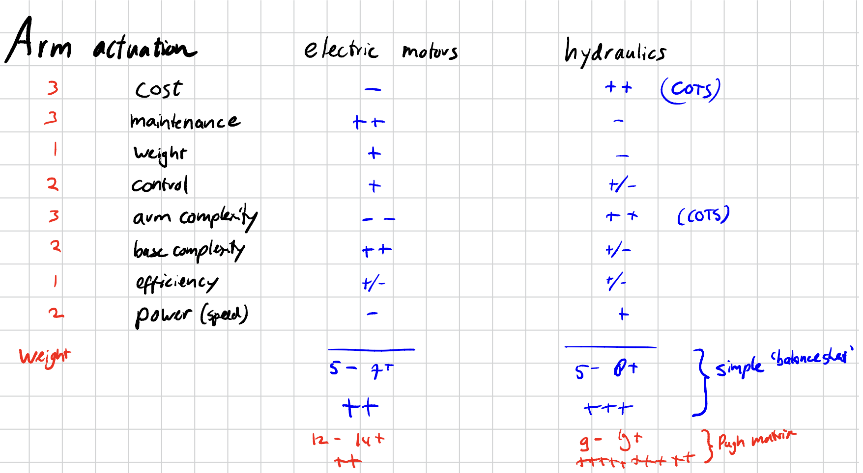 In the example above; at first glance most people would incline towards electric motors. But the sheet analysis (together with Pugh) makes it clear that hydraulics is actually better for the budget, constraints and overall attributes that we have / need.