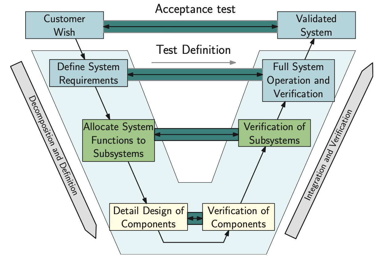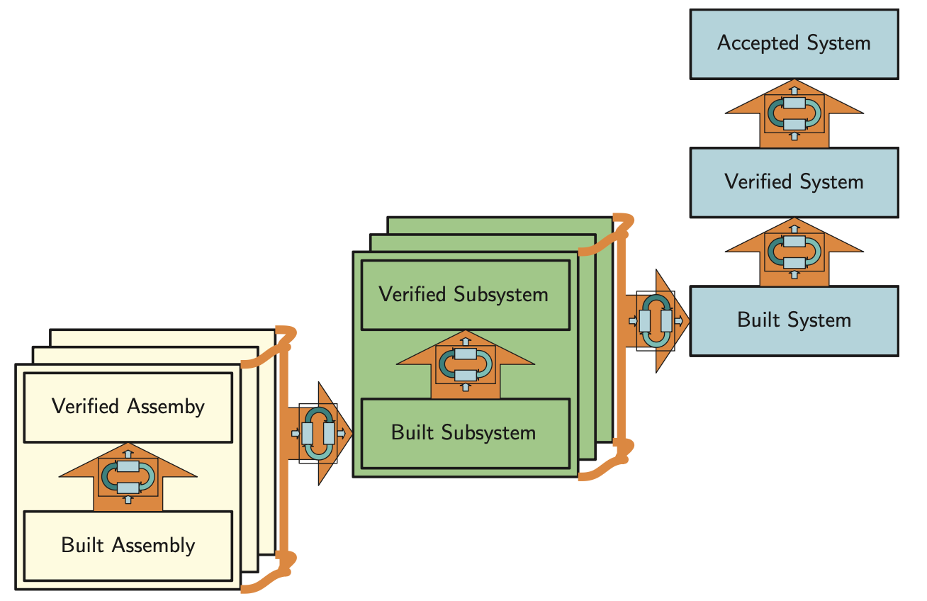 So far, this suggests that developing is done by “divide and conquer”. By splitting the initial problem into smaller, more manageable chunks and having the systems engineers watching the interfaces, the result will be a well functioning system. This is not necessarily so: when the assemblies become available, they have to be put together to become subsystems. The subsystems then have to be put together to finally form the requested system. Putting it all together and turning the power switch on will almost certainly not work the first time.