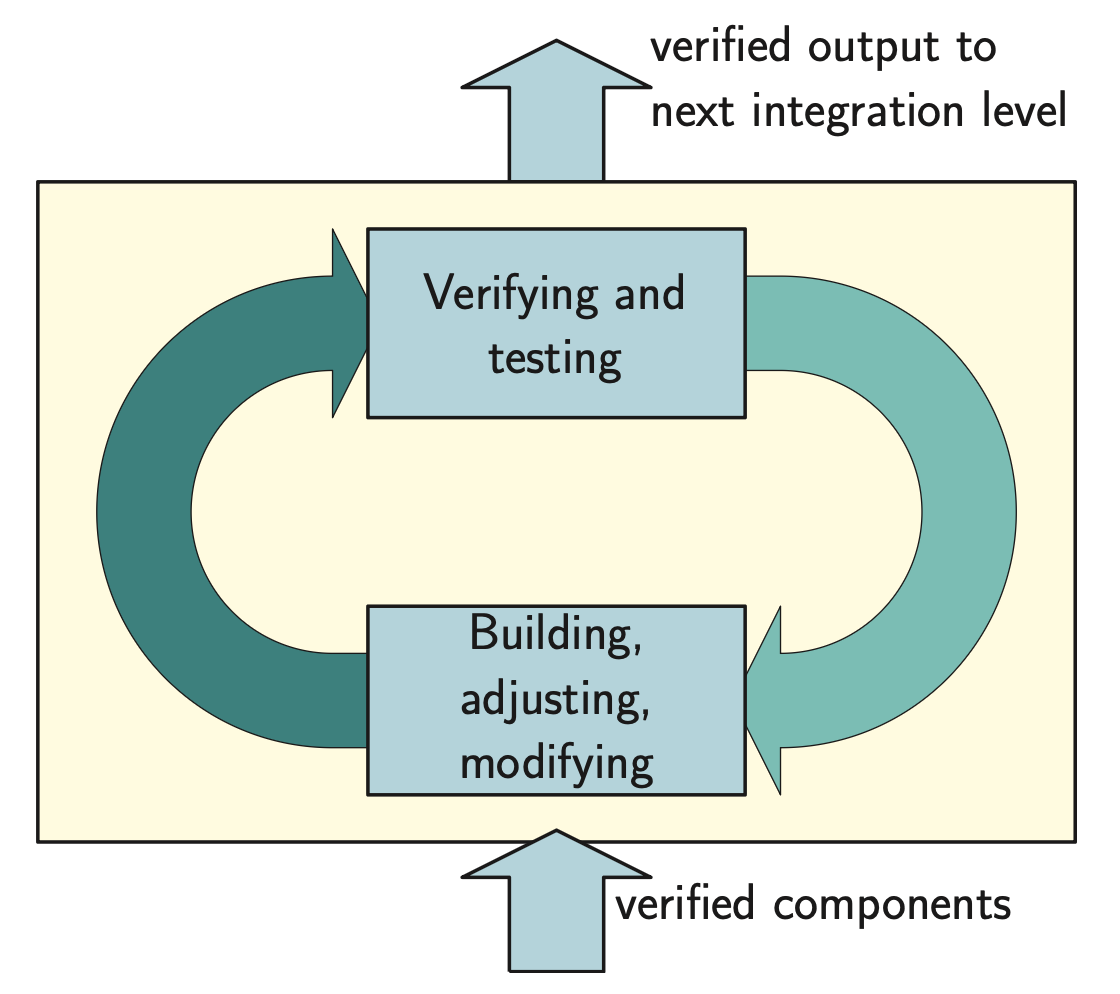 The integration step ensures that the individual components/assemblies/subsystems are in agreement with their requirements. Thus prior to proceeding to the next step in the integration process, verification (by means of testing, simulation, etc.) of the individual components/assemblies/subsystems has to be done. The outcome of the verification can be