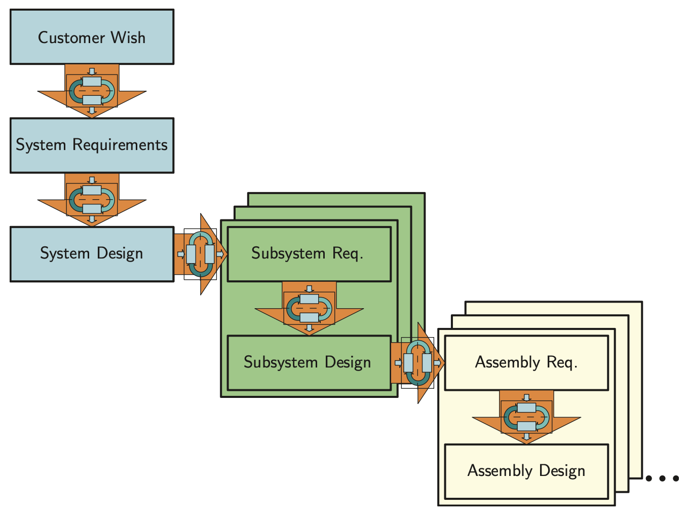 It does mean that when the level of detail increases, the number of parallel processes increases. In a design process this is often seen as group of parallel sub-projects in which each of the sub-projects develops a subsystem. This is visualized below. This figure shows how systems engineering repeats the same development process, shown in the Figure above on different levels: