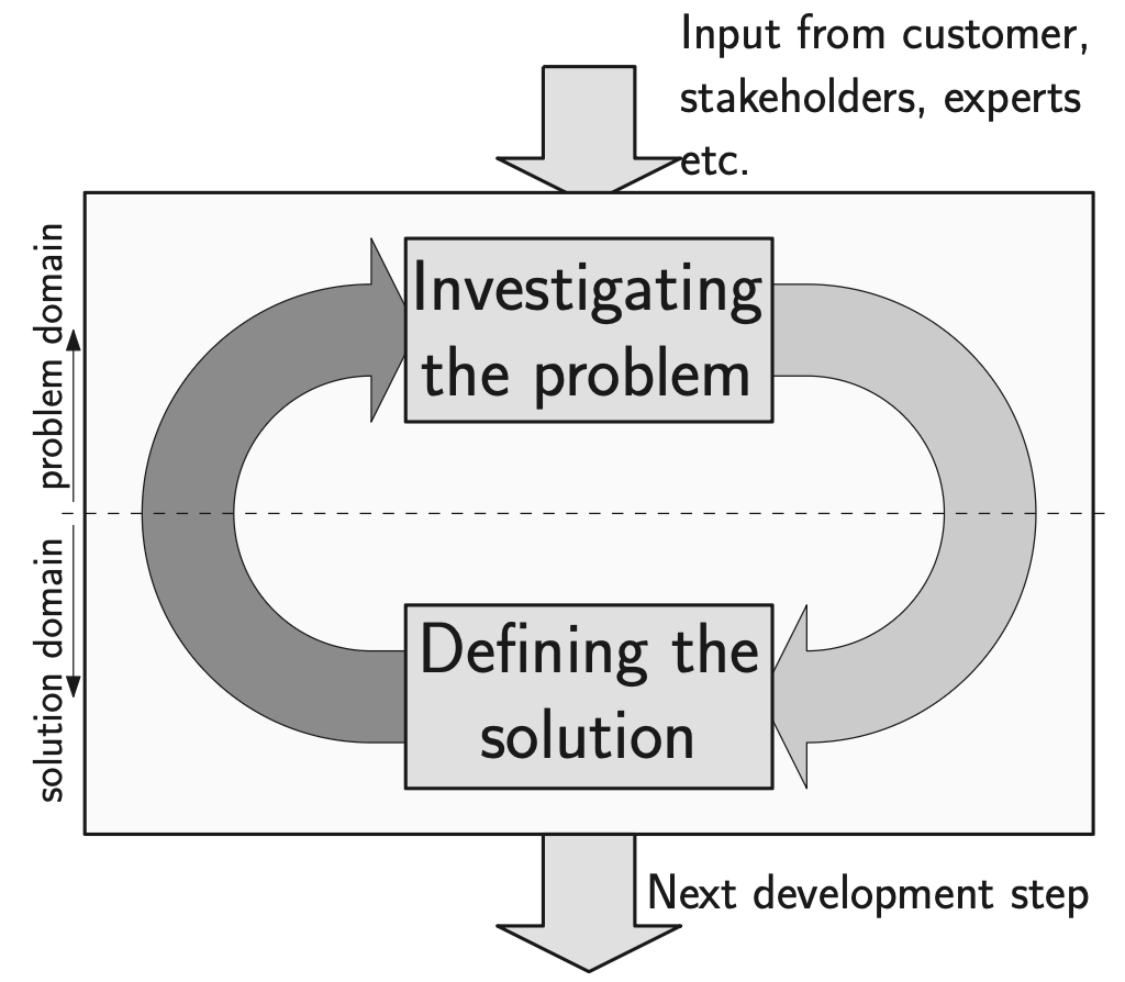 The top-level systems engineering process as a loop of exploring the issue and defining a solution. The right (downward) arrow is actually designing the solution. The left (upward) arrow depicts the verification: does the solution resolve the issue sufficiently and without too many negative effects?