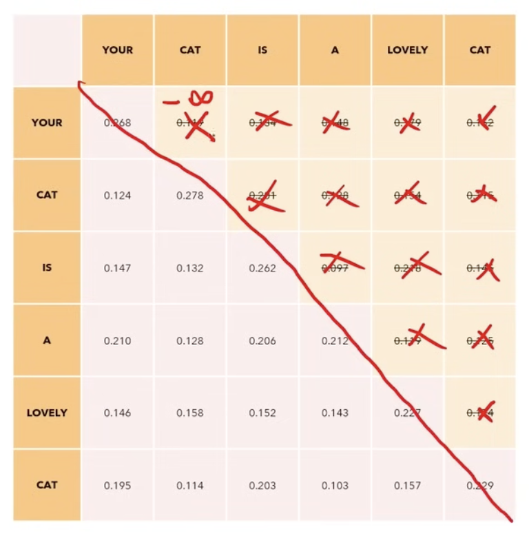- The softmax function ensures the values on each row sum up to 1. The values on each column represent how strong the words are correlated to one another.