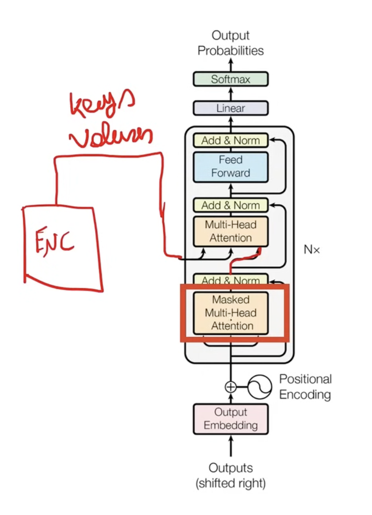 - On the decoder side of the transformer, we get the input from the encoder as (K,V) but the Query comes from the Masked Multi-Head Attention layer in the decoder. This is called cross multi-head attention.