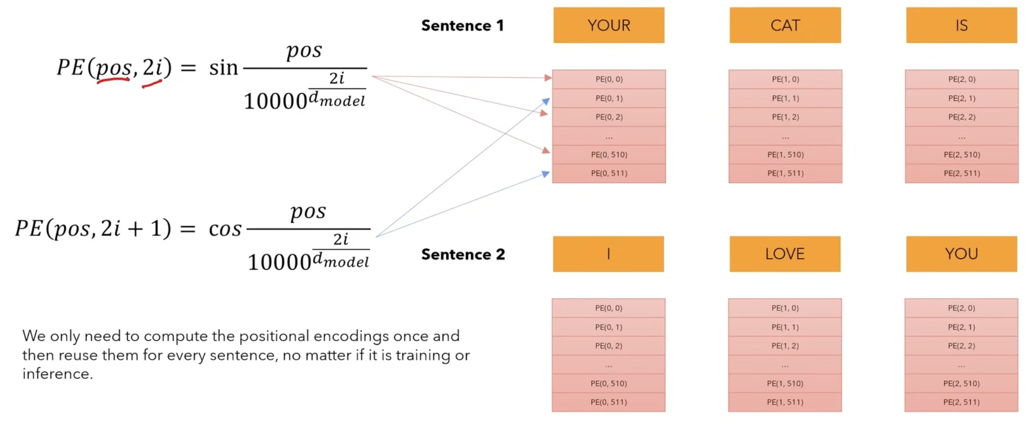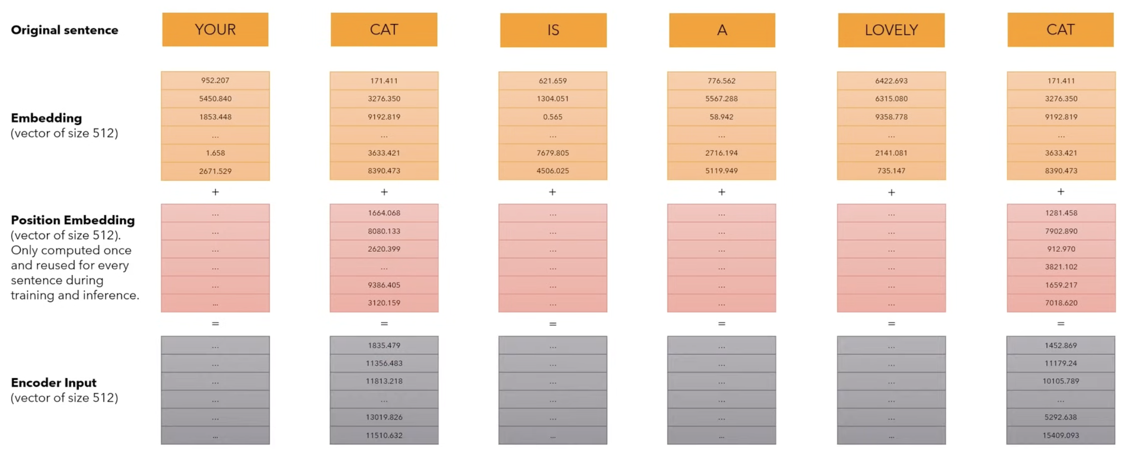 Having the original sentence, we first convert to embeddings using the previous layer, to which we add the Position Embedding Vector of size d_model which is only computed once, and not learned! This vector represents the position of the word inside of the sentence. The output should represent the encoder input of size d_model.
